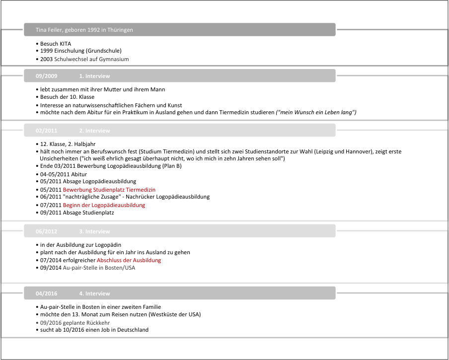 Der eingereichte Beitrag greift dazu auf Material aus einer qualitativen Längsschnittuntersuchung von Schülern (n = 100) zurück, die zwischen 2008 und 2012 bis zu dreimal zu ihrem schulischen Werdegang halboffen interviewt wurden. Die Präsentation wird sich dabei exemplarisch auf Fälle des potenziellen Bildungsaufstiegs konzentrieren, und diese auf die Problematik der Selbsteliminierung hin vergleichen. In einer Reihe von Fällen scheint anhand des objektiven Lebensverlaufs der Sachverhalt der bildungsbiographischen Selbsteliminierung gegeben. Trotzdem bleibt damit das methodische Problem der Identifikation und Lokalisierung von Habitusformation noch ungelöst. Denn am empirischen Material müsste für jeden Erhebungszeitpunkt rekonstruiert werden, ob und in welcher Weise sich anhand von biographischen Artikulationen im Interviewkontext (als einer sozialwissenschaftlich erzeugten Situation) eine Aufschichtung primärer, sekundärer und späterer Habitusformationen zeigen lässt, und inwiefern biographische Aufschichtungen habitueller Dispositionen als inkorporierte Schemata der Wahrnehmung, Beurteilung und Bewertung von bildungs- und berufsbiographischen Gelegenheiten nach dem Abitur wirksam werden.